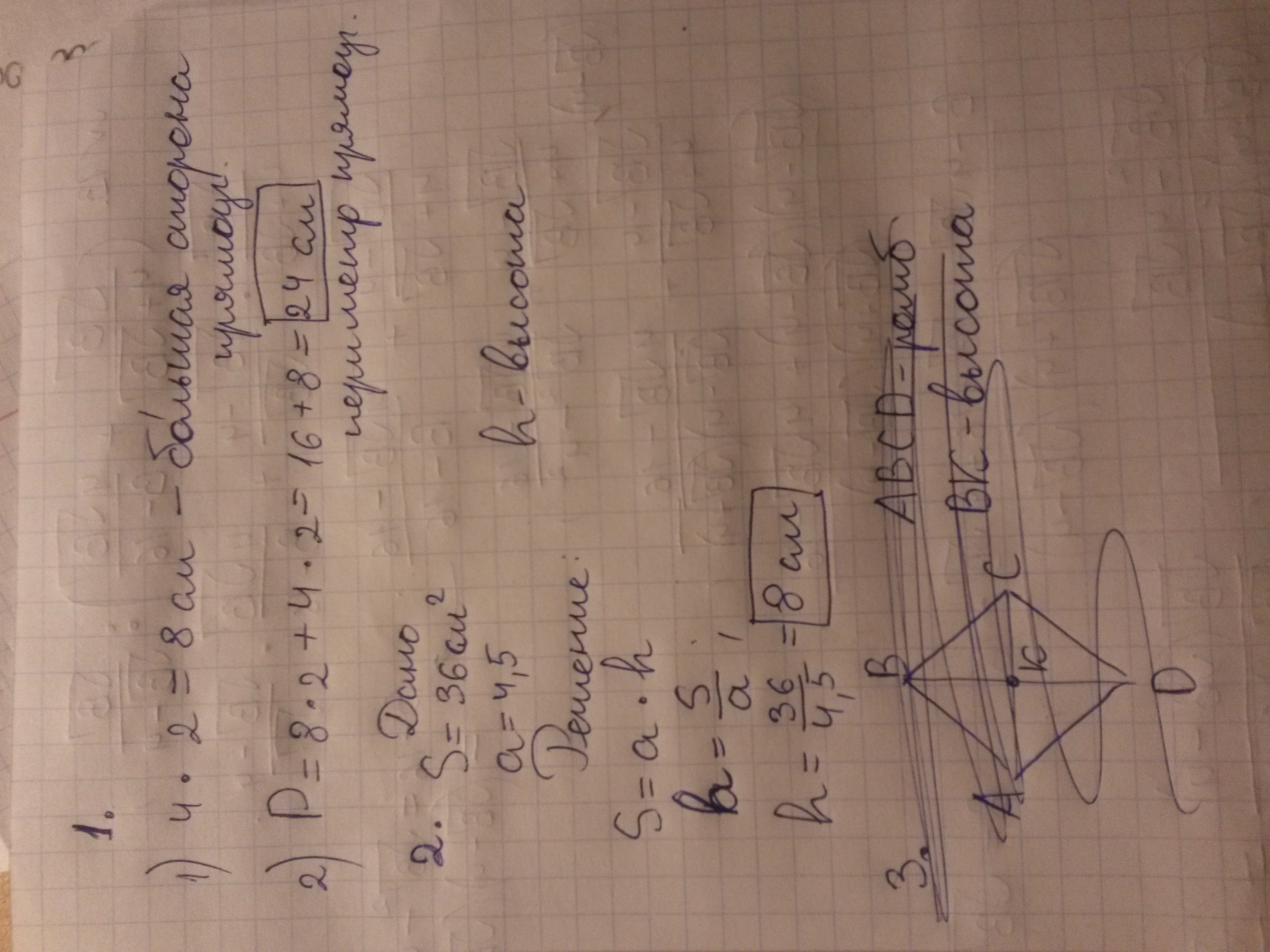 2) Найдите высоту ромба,сторона которого равна 4,5 см, а площадь 36 см^2