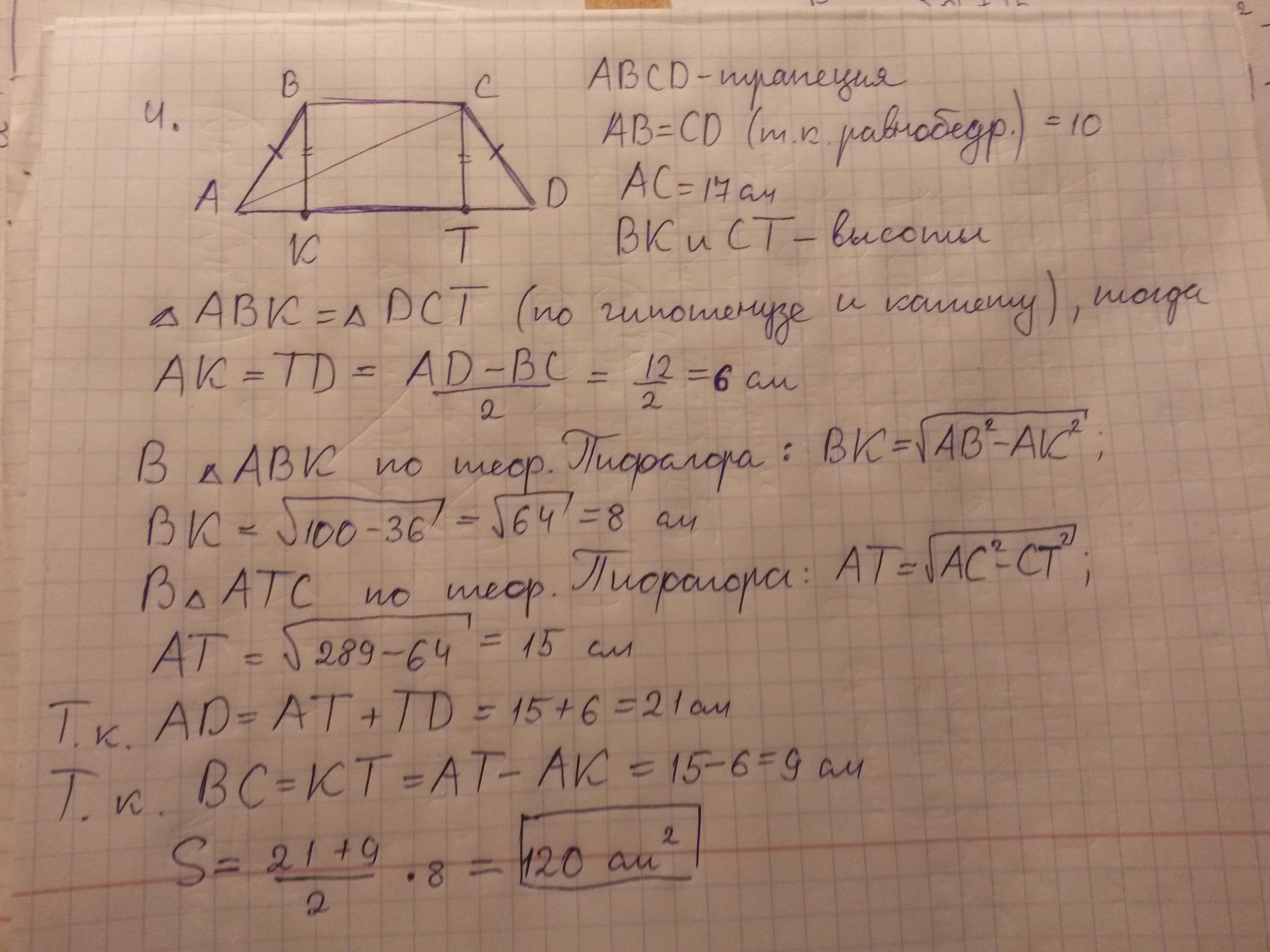 4)В равнобедренной трапеции боковая сторона равна 10 см, диагональ-17см,а разность оснований-12см. Найдите площадь трапеции.