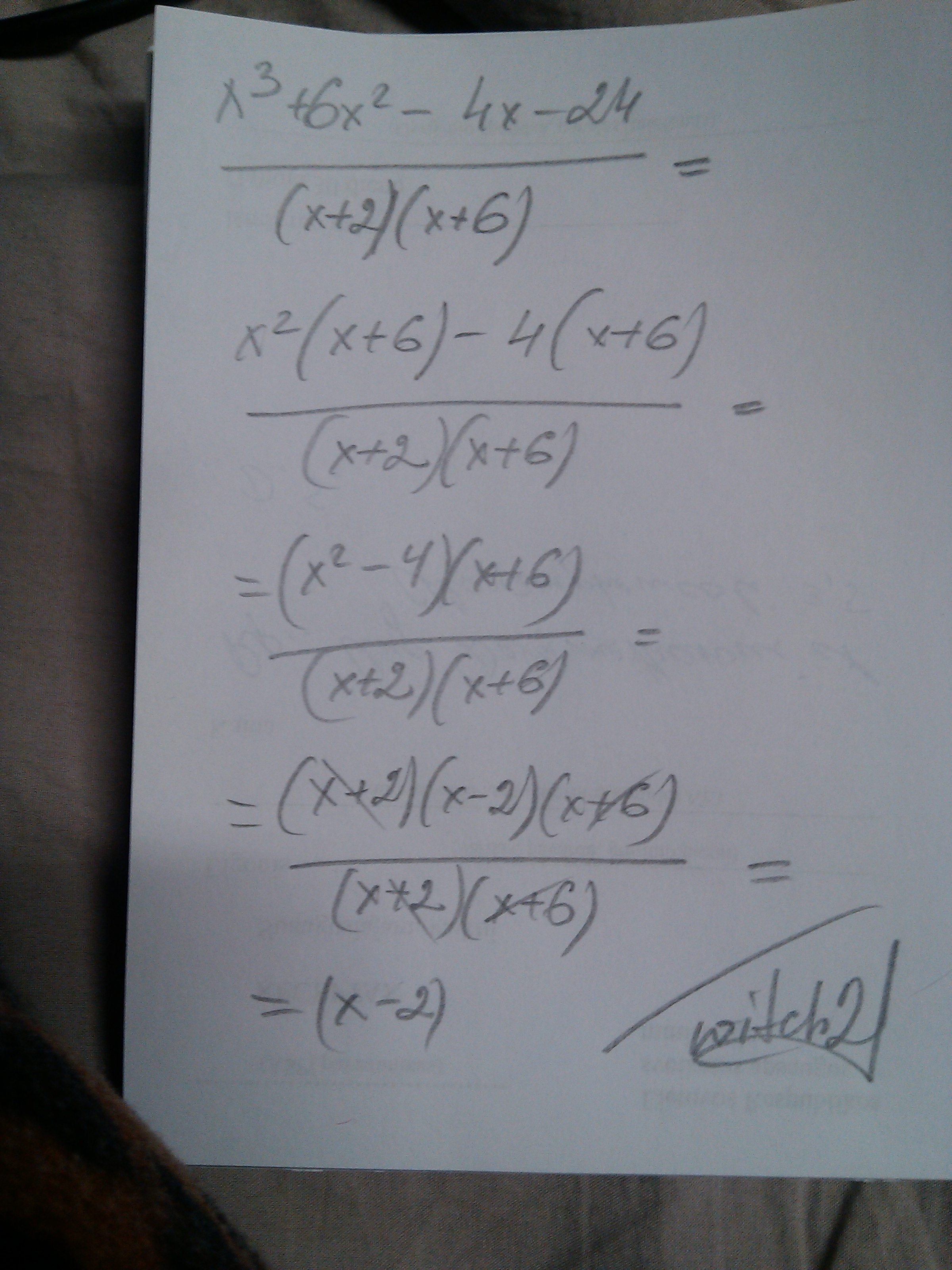 (х³+6х² - 4х - 24) / ((х+2)(х+6))=(х²(х+6) -4(х+6)) / ((х+2)(х+6))=((х-2)(х+2)(х+6)) / ((х+2)(х+6))=х+2