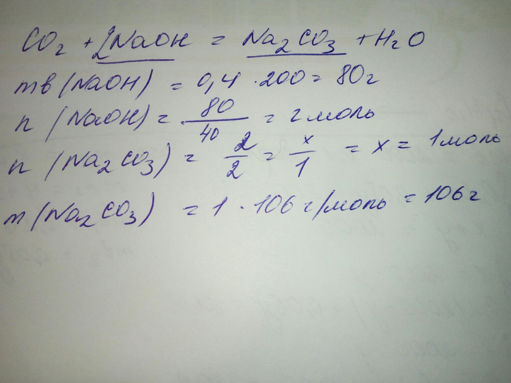 Найти массу кальцинированной соды,которая образуется при обработки углекислым газом 40процетного раствора гидроксида натрия массой 200г.(так же в задачи составить формулу))