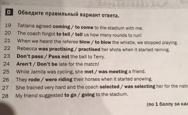 19 to come 20 to tell 21 blow 22 was practicing 23 don’t pass 24 don’t be 25 met каталась на велике когда встретила подругу 26 were riding 27 selected тренер выбрал ее 28 going