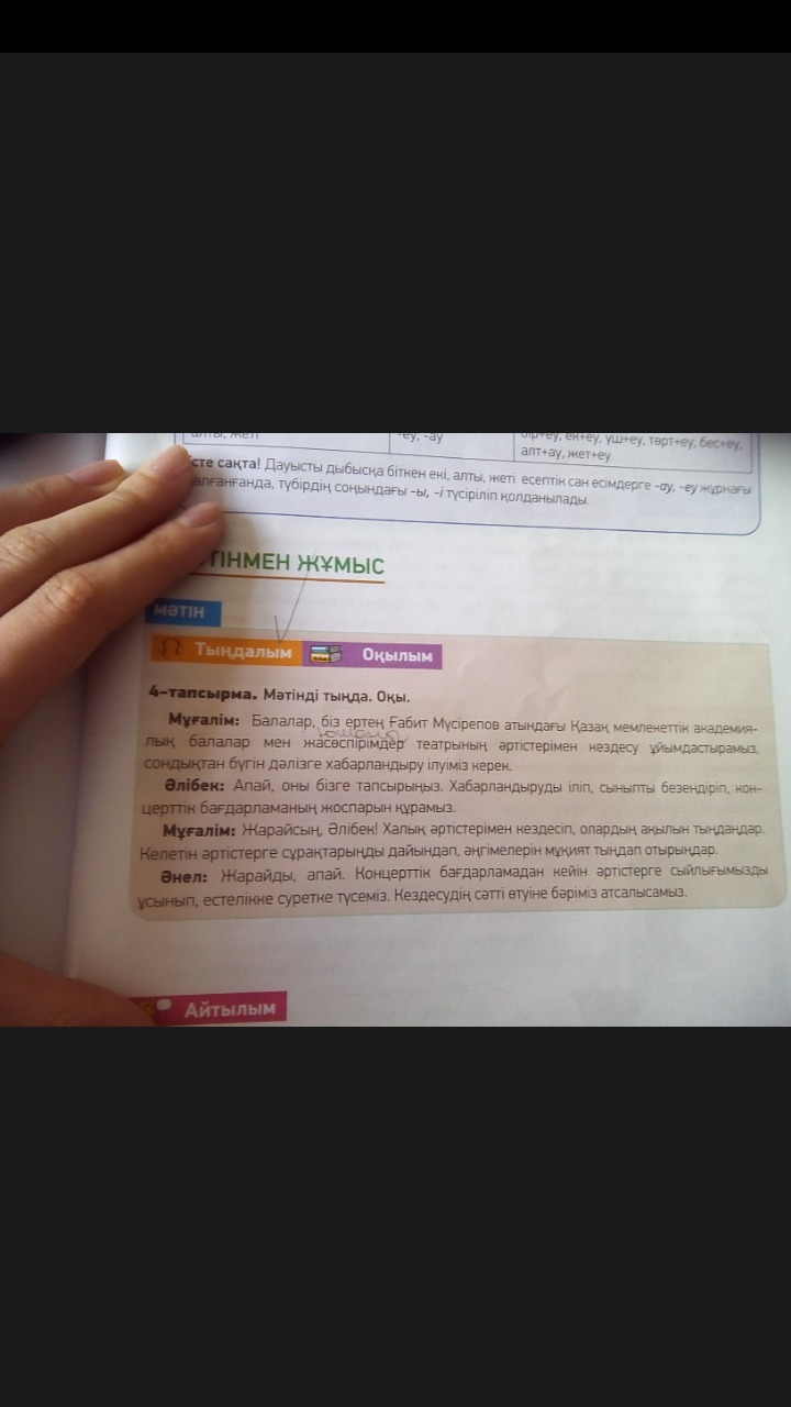 Учитель: Молодец, Алибек! Встретив народных артистов, слушайте их советов. Артистам подготовьте вопросы, рассказы внимательно слушайте.
