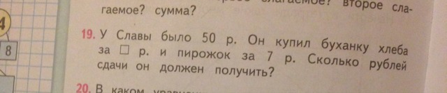 Пуская он купил буханку хлеба за Х рублей, тогда сдачи ему должны дать 50 рублей. После того как он купил пирожок за 7 рублей, в общем он потратил 7+Х рублей, значит ему должны дать сдачи 50 - 7 -Х = 43 (р.) - осталось Ответ: 43 рубля.
