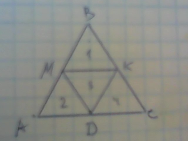 3) см фото. Проведем еще две средних линии. Получим четыре равных равносторонних треугольника. Площадь каждого из них равна 6 см².