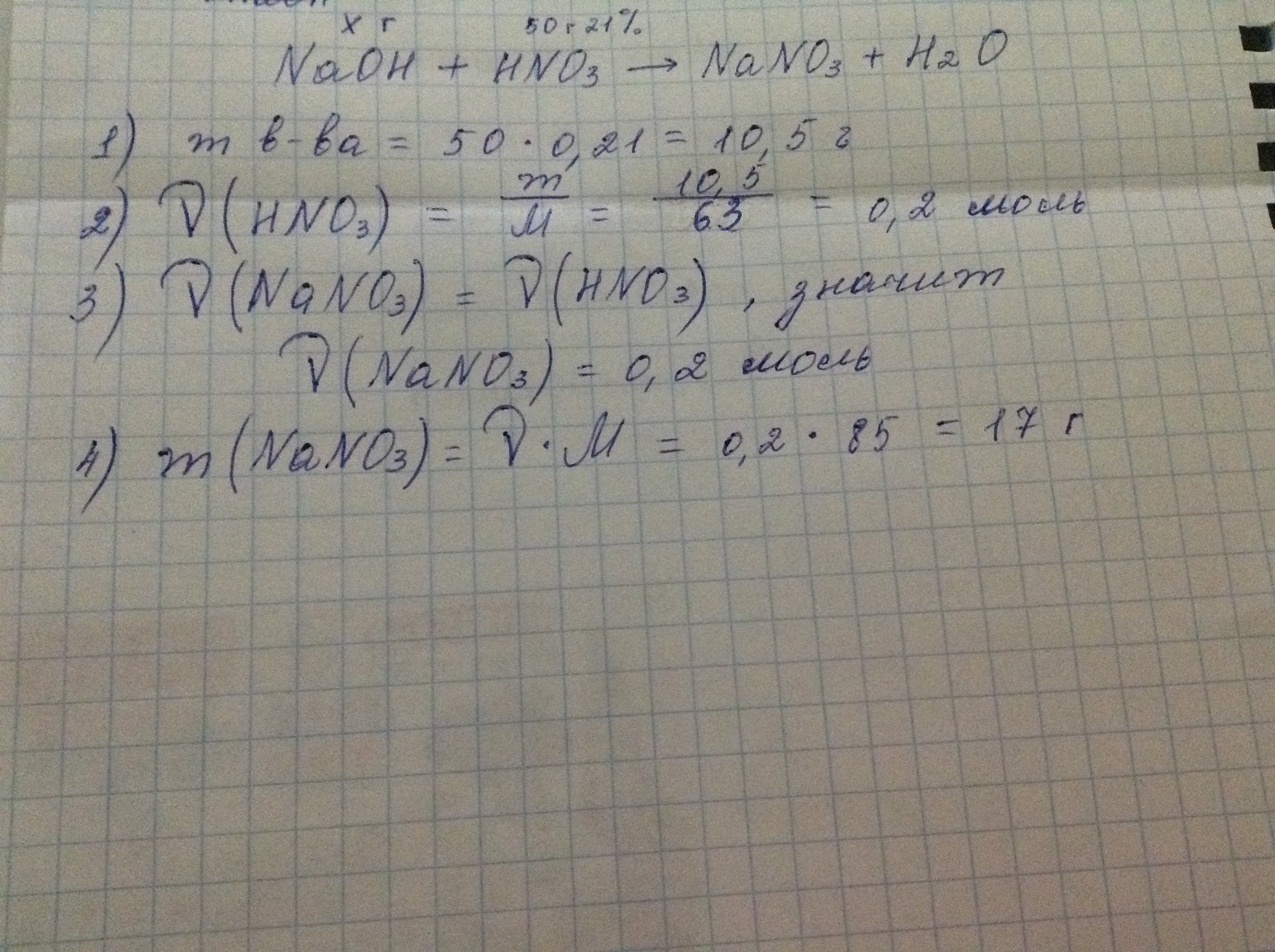 Определите массу соли, получившиеся в результате реакции нейтрализации раствора, содержащего гидроксид натрия, раствором азотной кислоты, масса которого 50 грамм. Массовая доля кислоты в данном растворе составляет 21%