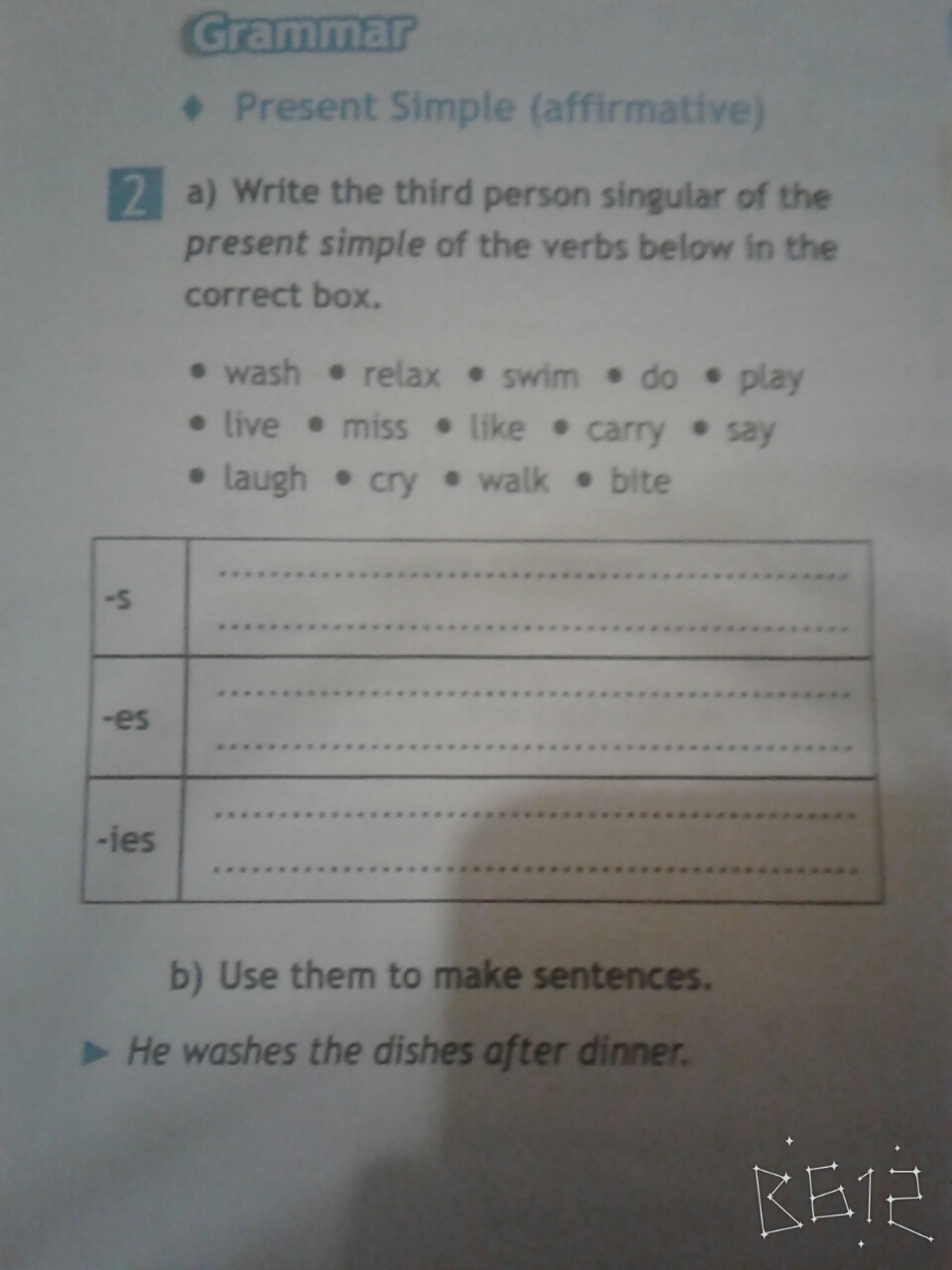 Washes, relaxes, swims, does, plays, lives, misses, likes, carries, says, laughs, cries, walks, bites