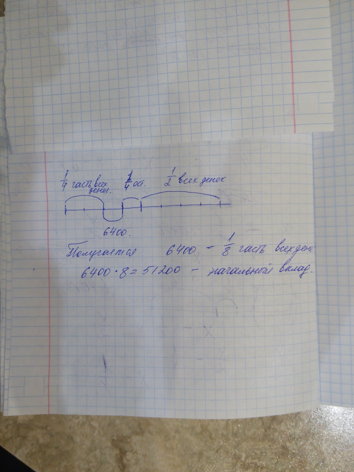 Вкладчик взял в банке 1/2 всех денег,затем 1/4 остатка и ещё 6400.После этого у вкладчика осталось в банке 1/4 часть первоначальных денег.Найдите величину начального вклада.