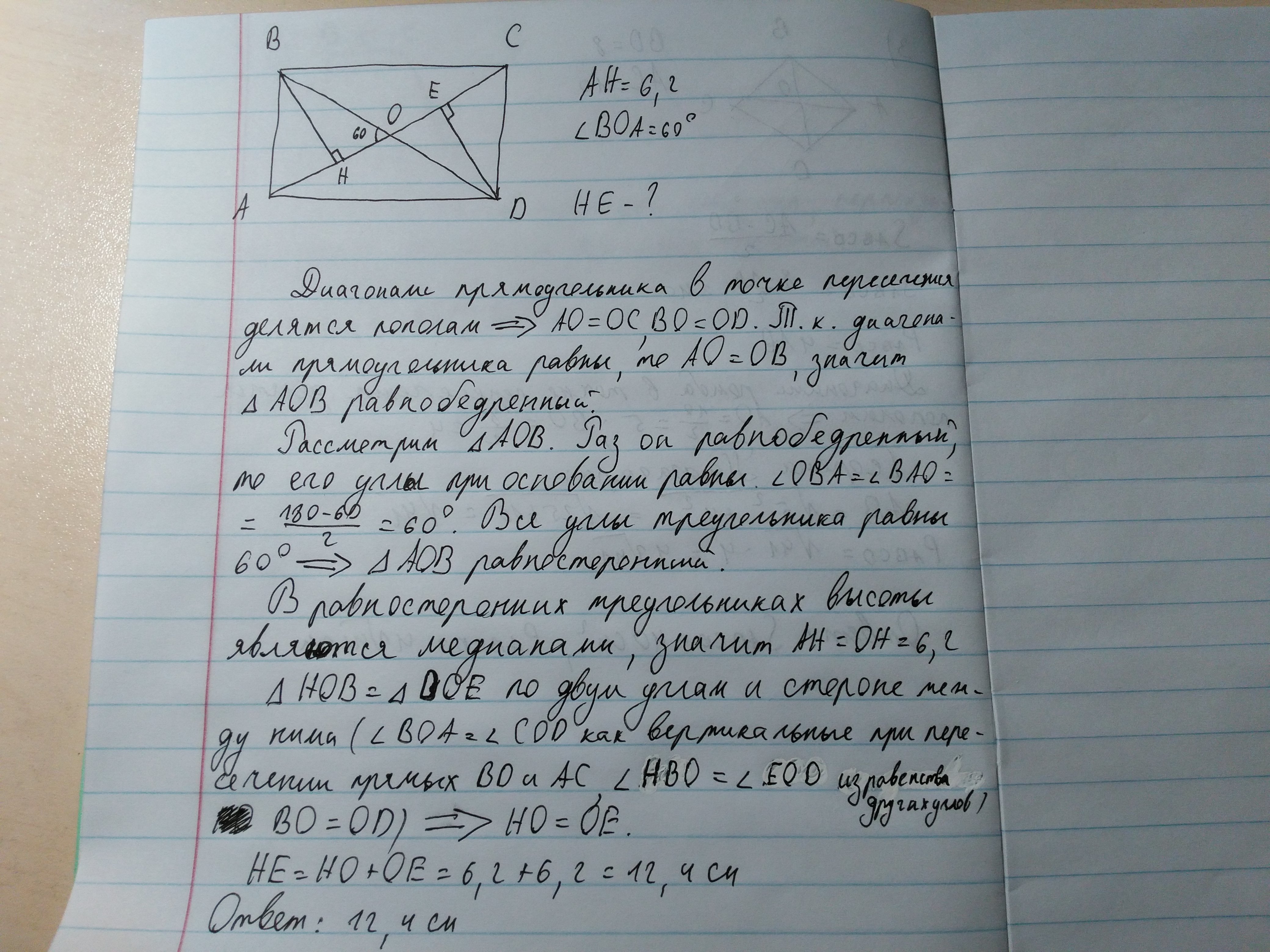 В прямоугольнике АВСD О - точка пересечения диагоналей, ВН и DE - высоты треугольников АВО и COD соответственно, ∠ВОН = 600, АН = 6,2. Найдите HE.