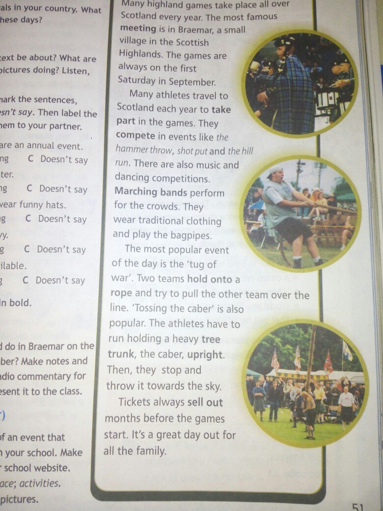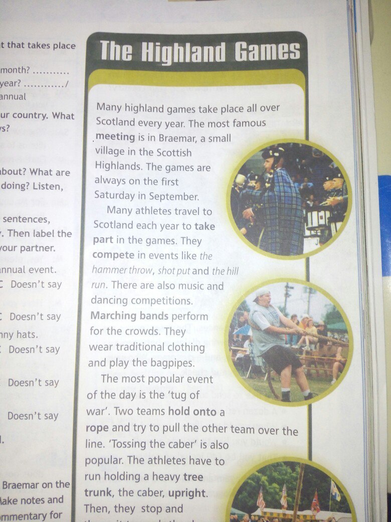 Много нагорных игр проводятся во всей Шотландии каждый год.Самые знаменитые проводятся в Брэйморе,маленькой деревушке у Шотландского Хайленда.Игры обычно начиаются в первую субботу Сентября.Много атлетов путешествуют в Шотландию каждый год чтобы принять участие в играх.Они соревнуются в разных видах таких как:Молотометание,Толкание ядра и Бег с холма.Также есть некоторые музыкальные и танцевальные соревнования.Марширующие группы выступают перед публикой.Они одеты в традиционную одежду и они играют на волынках.Событием дня является ,,перетягивание каната".Две команды держатся за верёвку и стараются перетянуть другую команду за свою линию......Прошу прощения,но дальше не видно,если сфотографируете 2 часть текста я обязательно переведу.