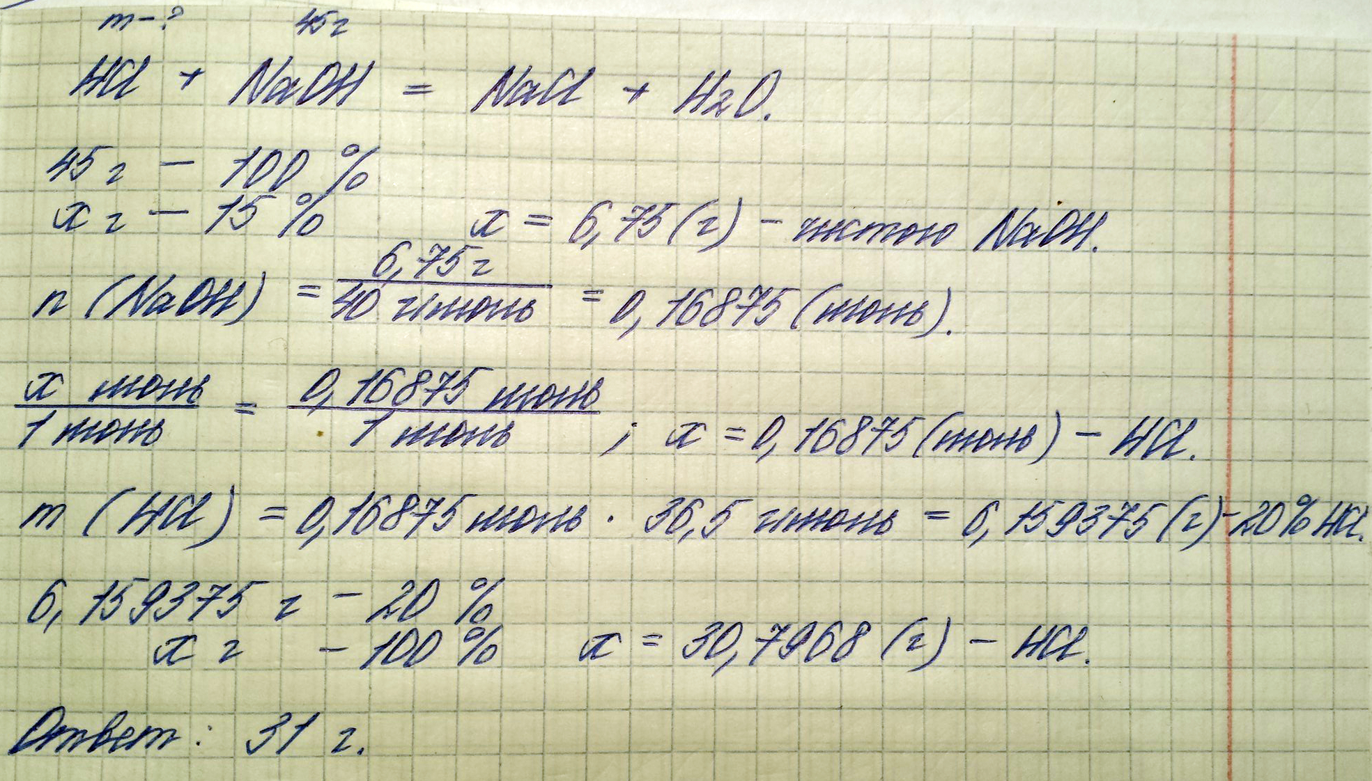 Какая масса раствора соляной кислоты с массовой долей HCI 20% потребуется для нейтрализации раствора гидроксида натрия массой 45г. С массовой долей NaOH 15%.