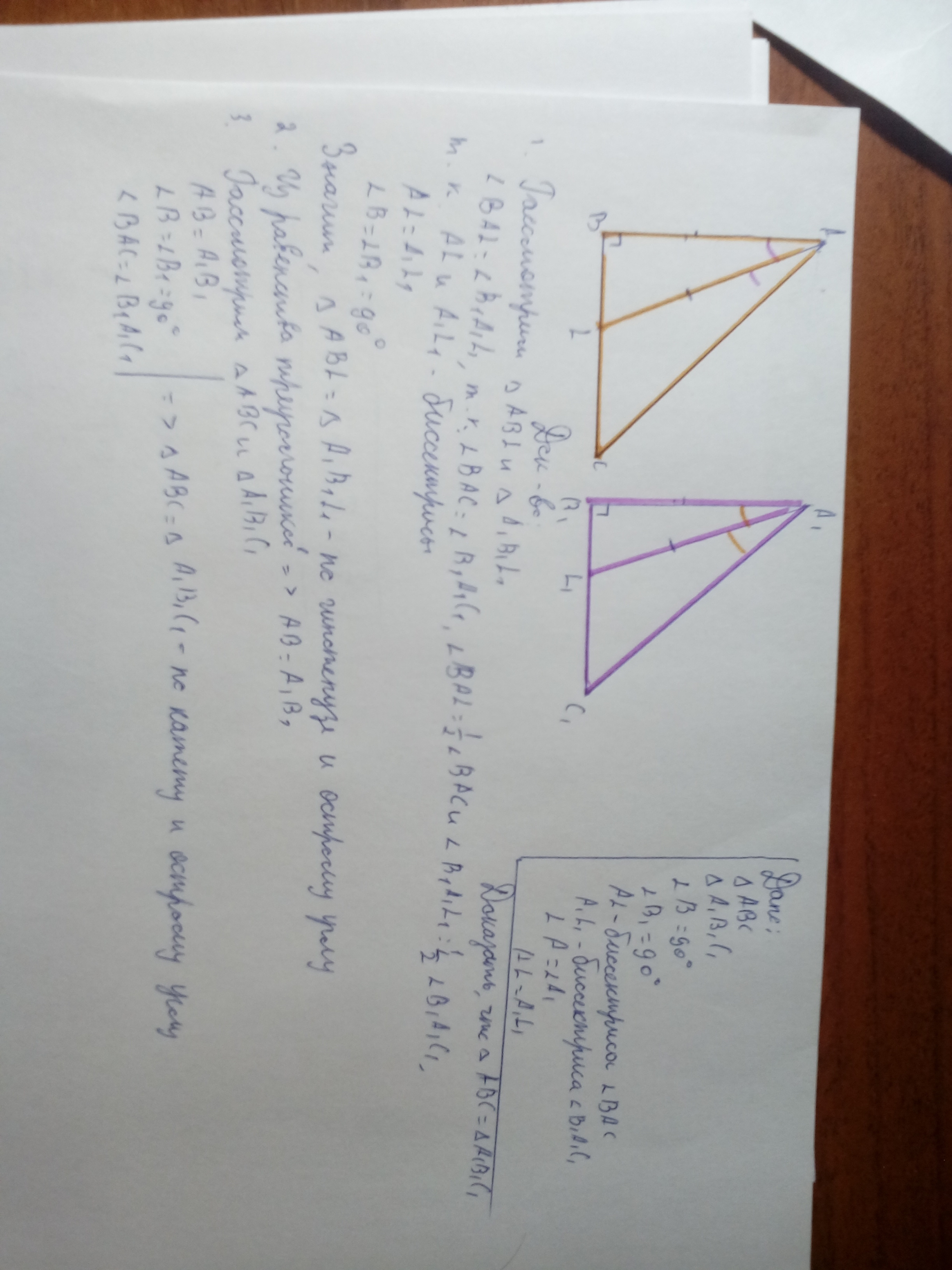 Докажите, что если острый угол и биссектриса, проведенная из вершины этого угла, одного прямоугольного угла, одного прямоугольного треугольника соответственно равны острому углу и биссектрисе, проведенной из вершины этого угла, другого прямоугольного треугольника, то такие треугольники равны.