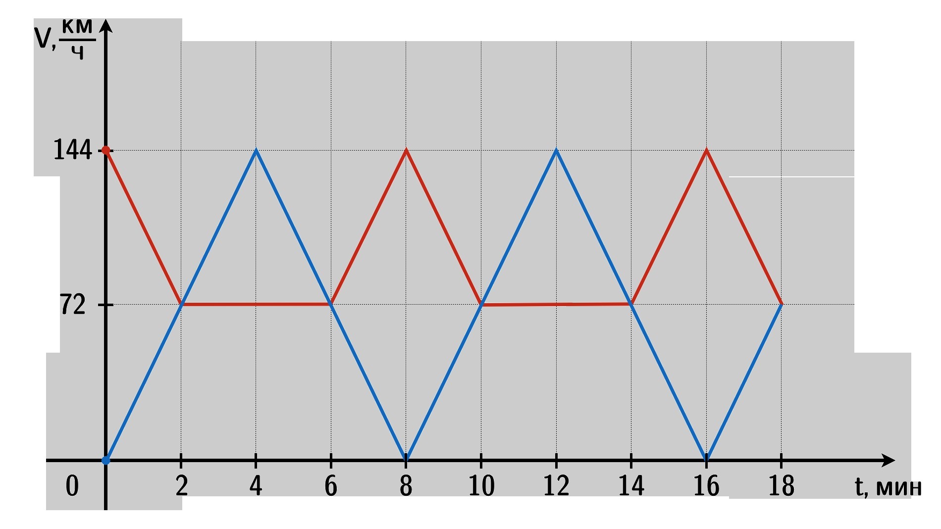 Две машины – красная и синяя – одновременно начали движение в одном направлении вдоль одной прямой. Графики зависимостей скоростей машин от времени приведены на одном рисунке. Какое максимальное расстояние было между машинами в процессе их движения за т18 минут, если при старте красная машина опережала синюю на 800 м? Ответ выразить в км, округлив до десятых.