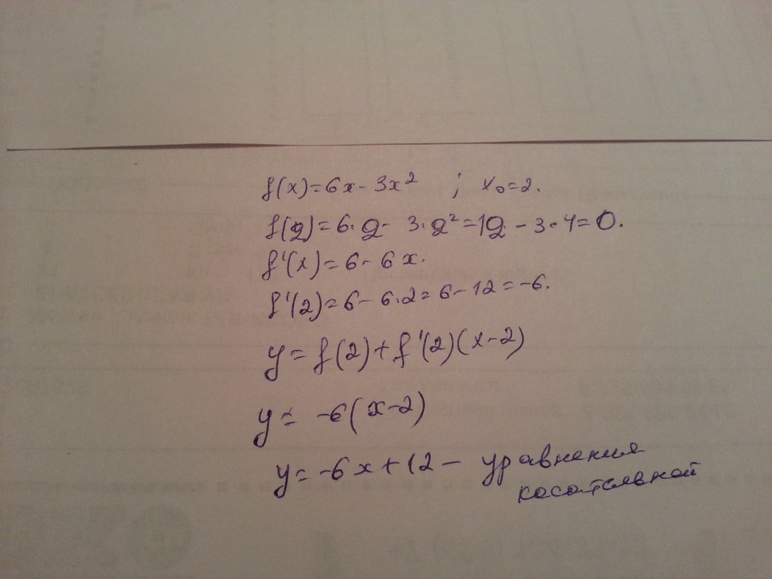Написать уравнение касательной к графику функции y=f(x) в точке с абсциссой x0, если f(x)=6x-3x^2, x0=2.