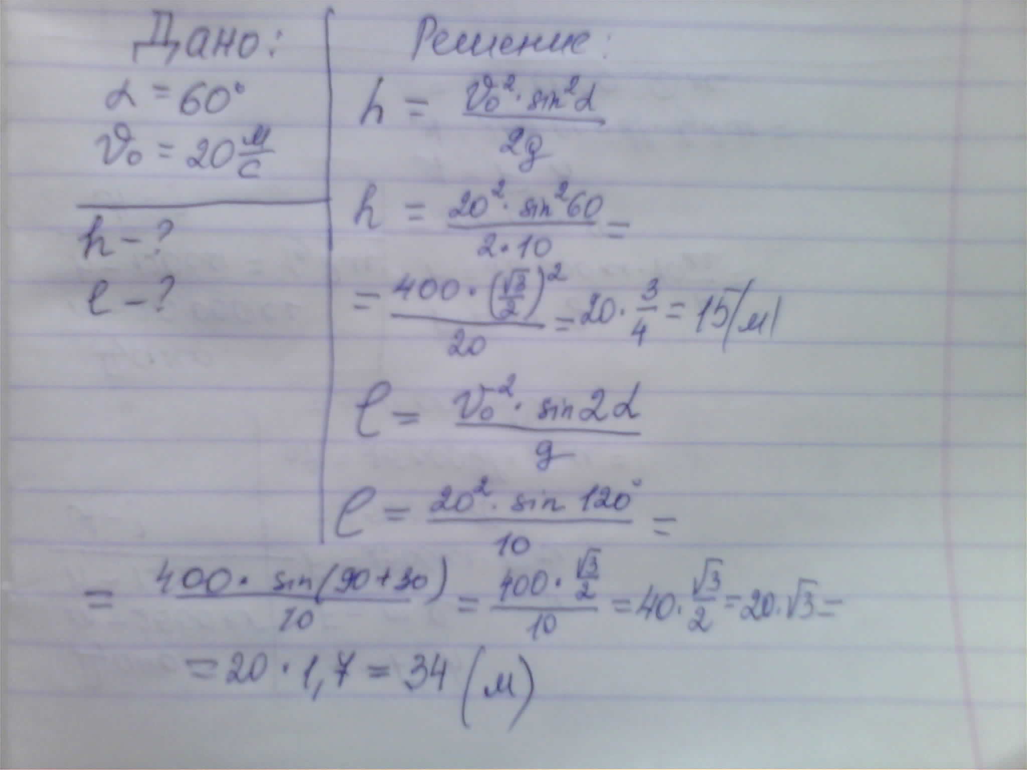 Мяч брошен под углом а = 600 к горизонту со скоростью Vo = 20 м/с. Определить наибольшую высоту подъема и дальность полета мяча.