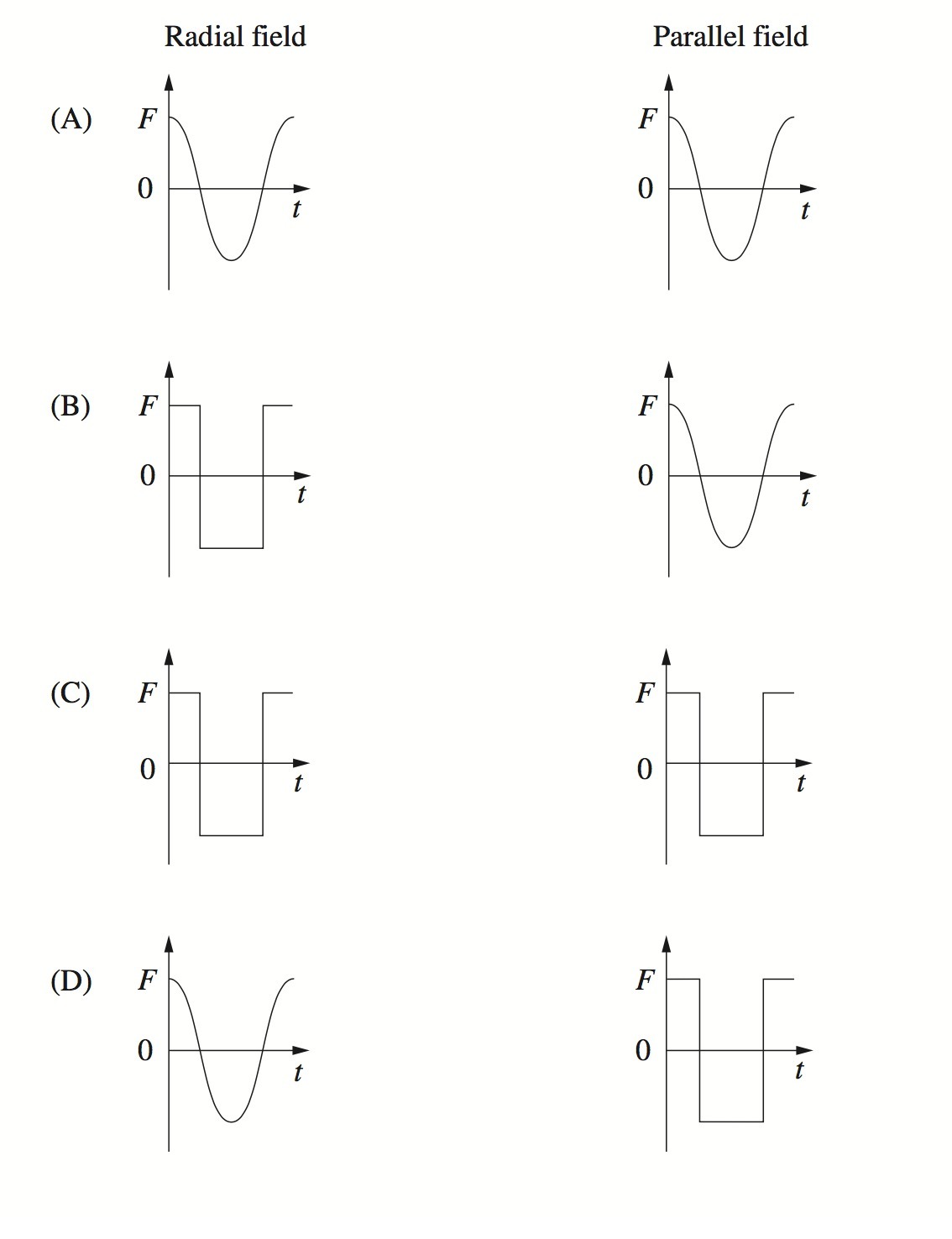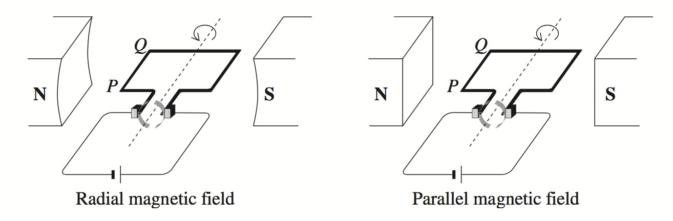 Схемы показывают рамку, которая вращается против часовой стрелки в магнитном поле двух типов магнитов. Один - обычный плоский (справа - parallel magnetic field), вторая пара магнитов слегка вогнута (слева - radial magnetic field). Через контур рамки подается постоянный электрический ток.