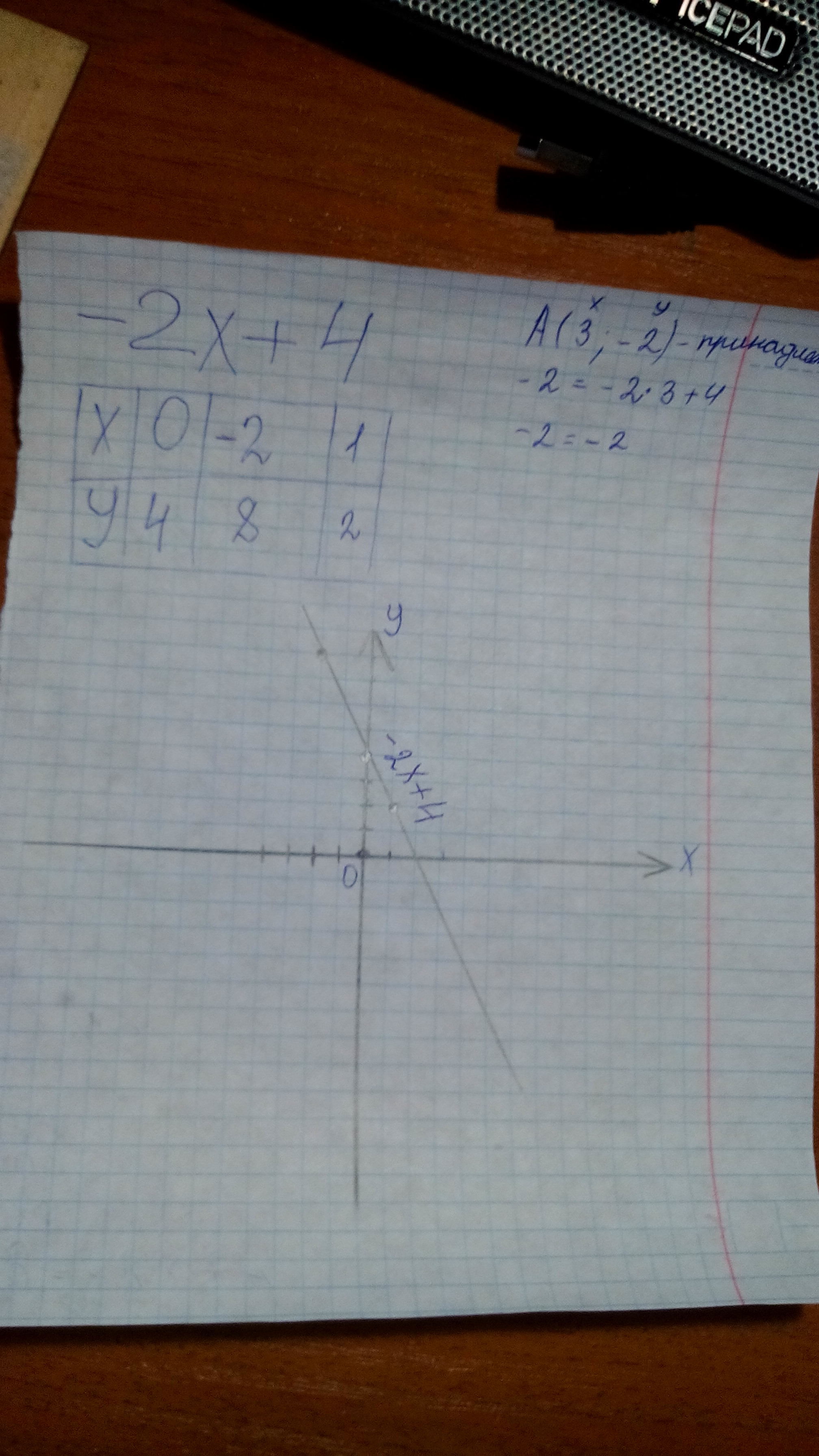 Постройте график функции y = –2x + 4. Проходит ли этот график через точку А(3; –2)?