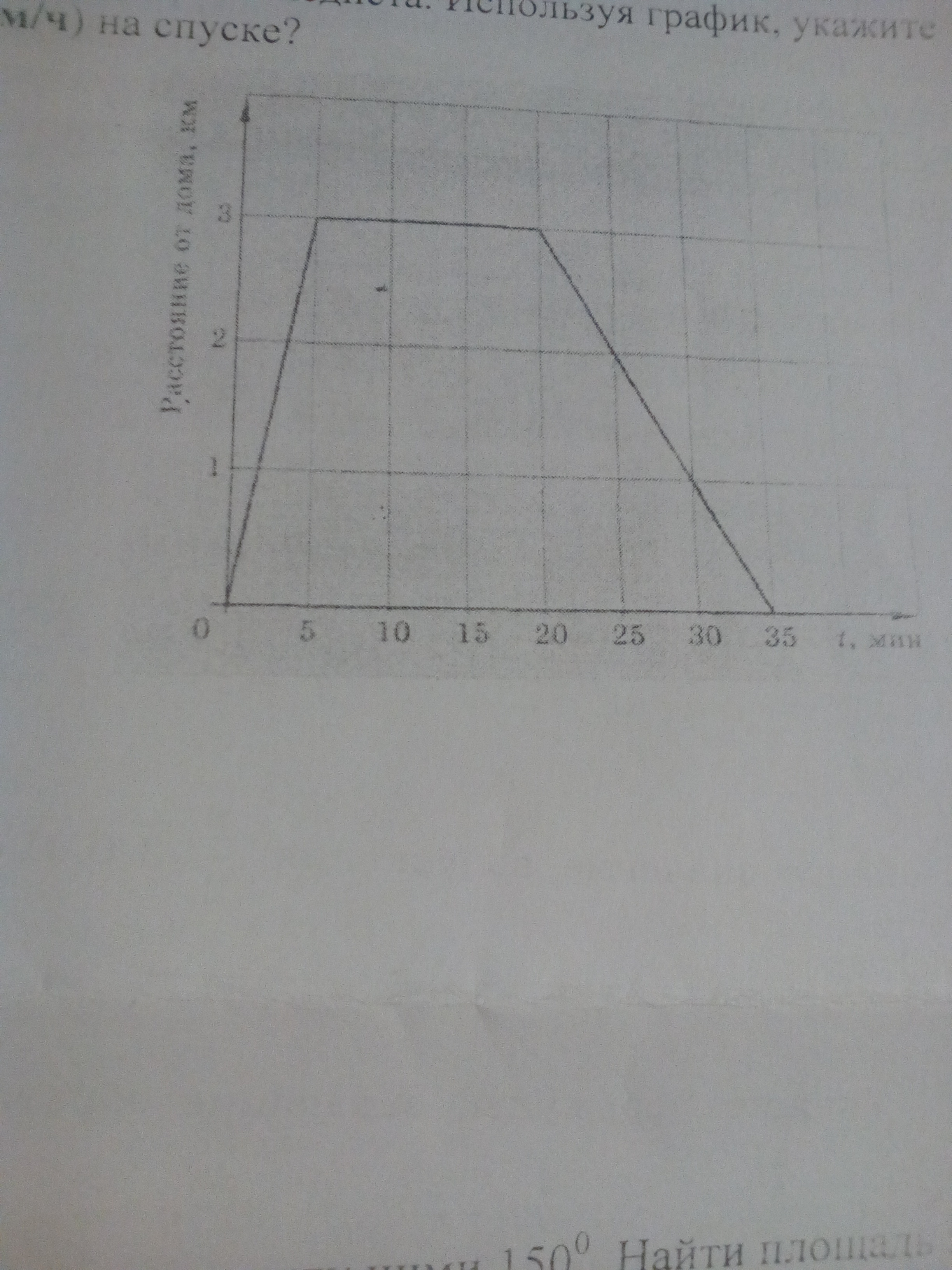 Велосипедист проехал по дороге, идущей вниз, от своего дома до почты и затем вернулся домой. На рисунке изображен график движения велрсидедиста. Используя график, укажите какова былр скорость велосипедиста (км/ч) на спуске?