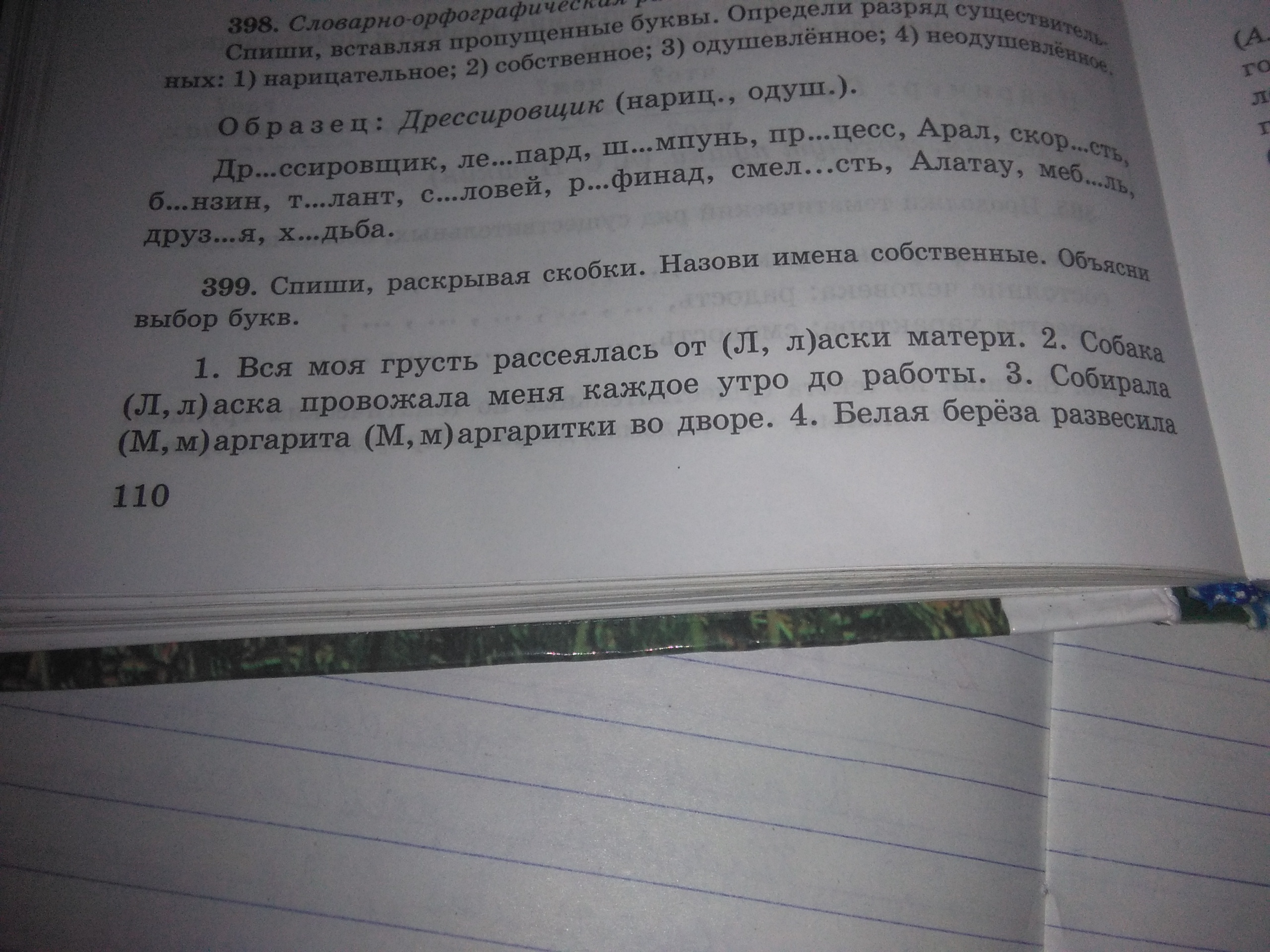 1. Вся моя грусть рассеялась от ласки матери. 2. Собака Ласка (имя собств.) провожала меня каждое утро до работы. 3. Собирала Маргарита (имя собств.) маргаритки во дворе. 4. Белая берёза развесила свои серёжки. 5. Навстречу отцу выбежал Серёжка (имя собств.) и повис у него на шее. 6. У льва был очень грозный и царственный вид, и дрессировщик Лев (имя собств.) не осмелился подойти к нему.