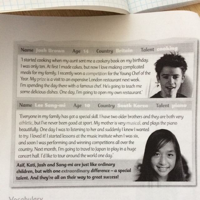 "Все в моей семье обладают особыми навыками. У меня есть два старших брата и они очень атлетичны, но я никогда не была хороша в спорте. Моя мама очень музыкальная и красиво играет на пианино. Однажды я послушала ее игру и вдруг поняла, что хочу попробовать. Я люблю это! Я начала ходить на уроки в музыкальном институте когда мне было 6 лет, и вскоре я выступила и победила на конкурсе, который проводился по всей стране. В следующем месяце я поеду в Японию, чтобы сыграть в большом концертном зале. Однажды я хочу поехать в тур по всей стране."