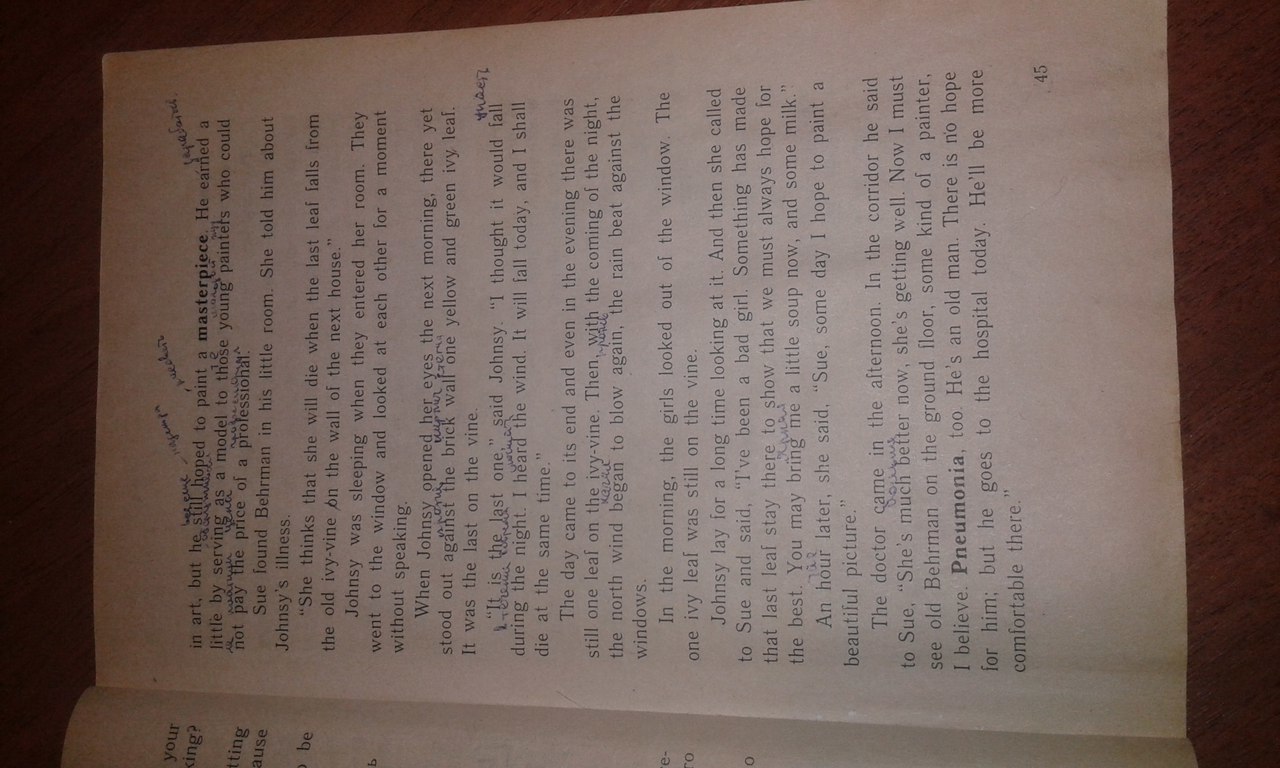 "Я должна тебе кое-что сказать, дорогая," - сказала она. "Мистер Берман умер сегодня в больнице. Он болел всего лишь 2 дня. В первый день его нашли в его комнате беспомощным. Его обувь и одежда были мокрыми, а сам он очень замерз. В его комнате также нашли фонарь и лестницу, несколько кистей и желтые и зеленые краски. А теперь выгляни в окно, дорогая, и посмотри на последний лист плюща на стене. А ты знаешь, почему он никогда не колыхался от ветра? О, дорогая, а ведь это шедевр Бермана - он рисовал его в ту ночь, когда упал последний лист."