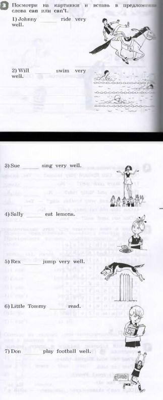 Посмотри на картинки и вставь в предложения слова can или can't. 1. Johnny____ride very well. 2. Will _____ swim very well. 3.Sue _____ sing very well. 4. Sally_____eat lemons. 5.Rex____jump very well. 6 . Little Tommy_____read.7. Don ____play football well.