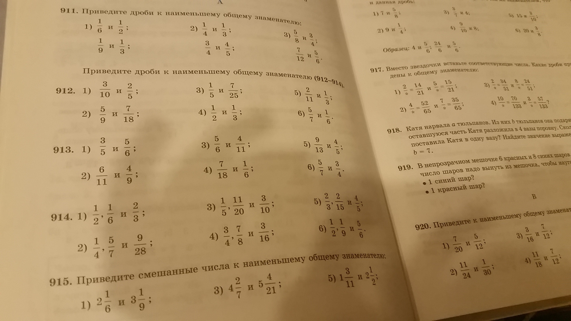 в 912 ;913 примерах 3/10 и 2/5 общий 10.а где примеры такие как 9/13 и 4/5 то надо 13×5=65это и будит наименьшим делителем.а в 914 находиши для трёх делителей например 1/2,1/9,и5/6 у них делитель 18 то есть он делится на 2;9;6.
