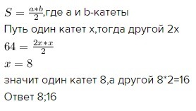 Площадь прямоугольного треугольника равна 64см2 . найди его катеты если первый из них в 2 раза больше другого