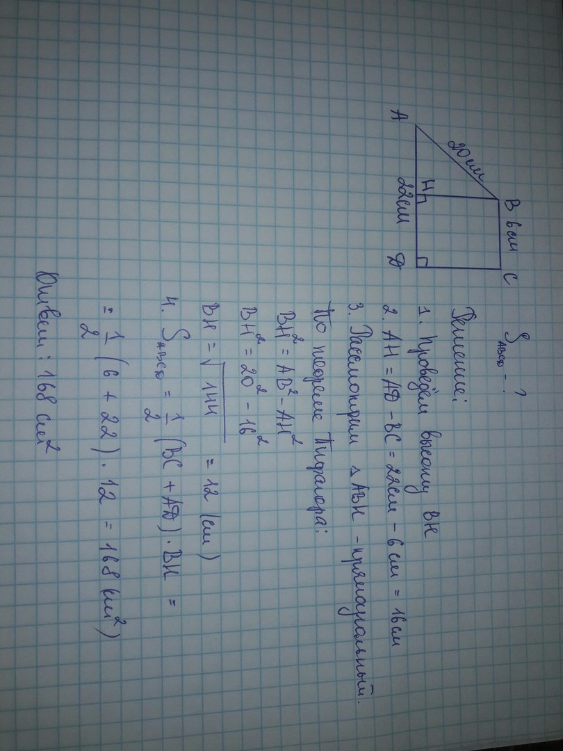 в прямоугольной трапеции основания равны 22 см и 6 см, большая боковая сторона 20 см. Найдите площадь трапеции.