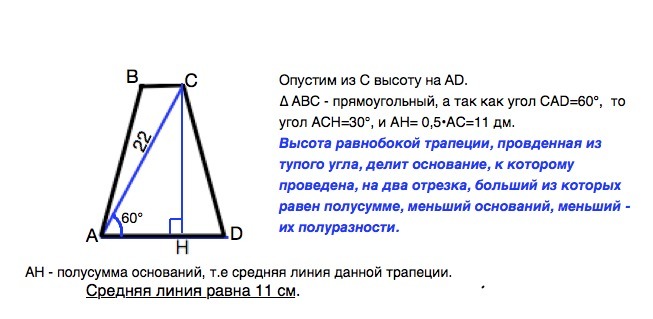 в равнобокой трапеции ABCD (AB=CD) диагональ AC=22 дм.,угол CAD=60 градусам.Найдите среднюю линию трапеции.