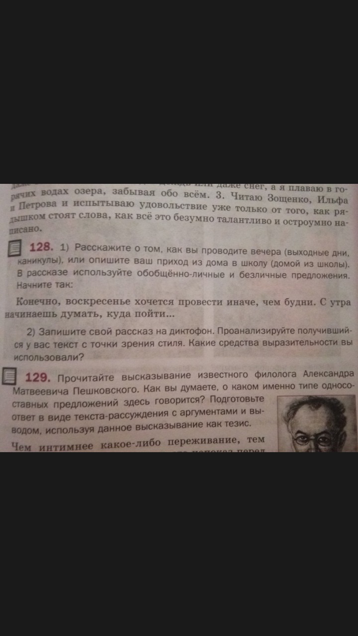 расскажите о том, как вы проводите вечер (выходные дни, каникулы) или опишите ваш приходит из дома в школу ( домой из школы) в рассказе используйте обобщённо-личные и безличные предложения. Прошу помогите!!! Упр 128) заранее спасибо