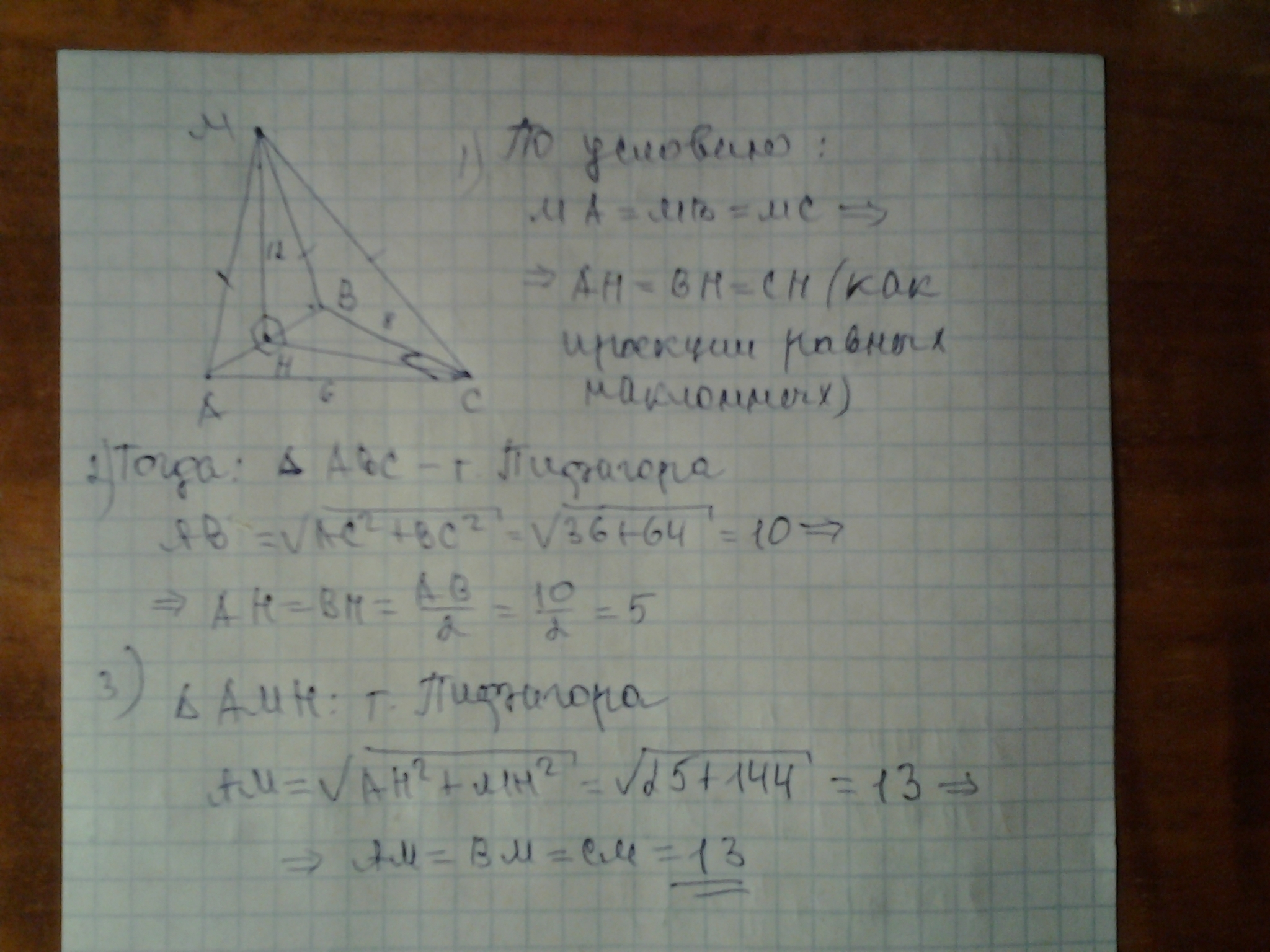 Помогите пожалуйста(рисунок обязательно)!Точка М равноудалена от всех вершин прямоугольного треугольника, катеты которого 6 см и 8 см. Расстояние от точки М до плоскости треугольника = 12 см. Найти расстояние от точки М до вершин треугольника