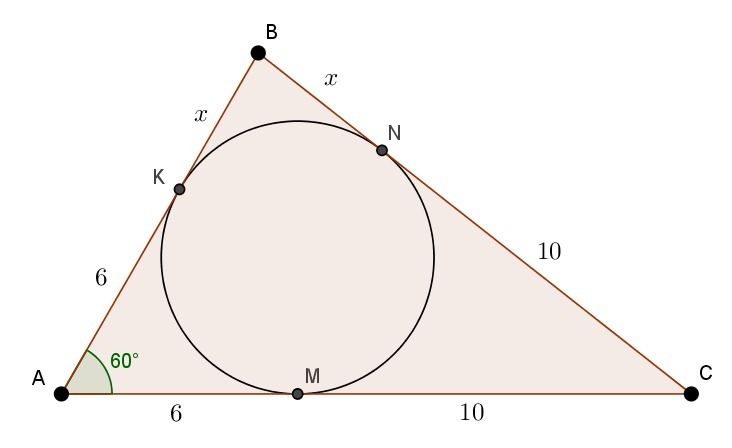 Отрезки касательных, проведённых из одной точки к окружности, равны. Поэтому (см. рисунок) AK = 6, CN = 10, BK = BN = x.