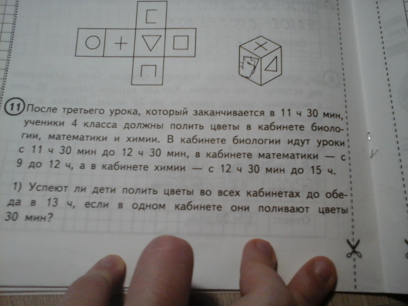 1 надо полить цветы в кабинете химии , т.к. там уроки с 12, а если они в 11:30 пройдут поливать, то к 12 освободятся.Потом полить в кабинете математики (как раз до 12:30)И затем в кабинете биологии!!!