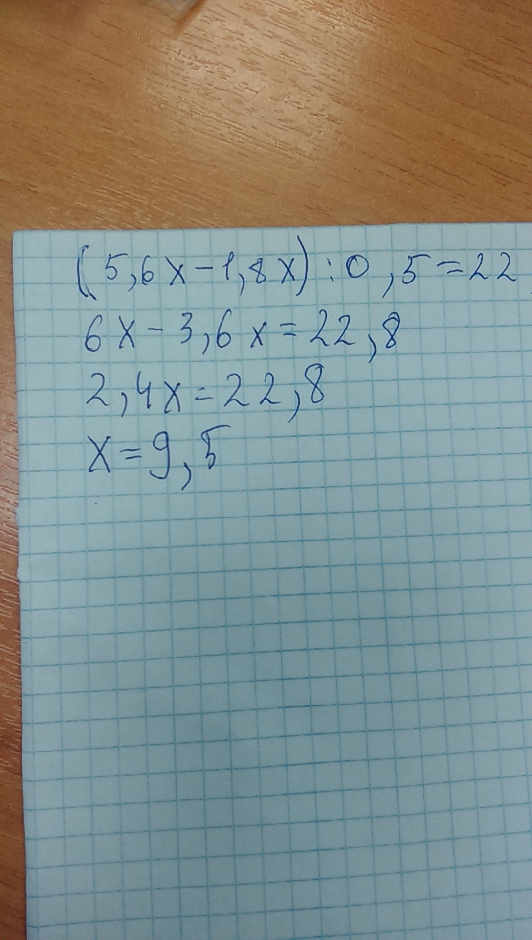 (5,6x - 1,8x) : 0,5 = 22,8,