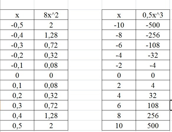 1) 8х² для значений х из промежутка от -0,5 до 0,5 с шагом, равным 0,1;