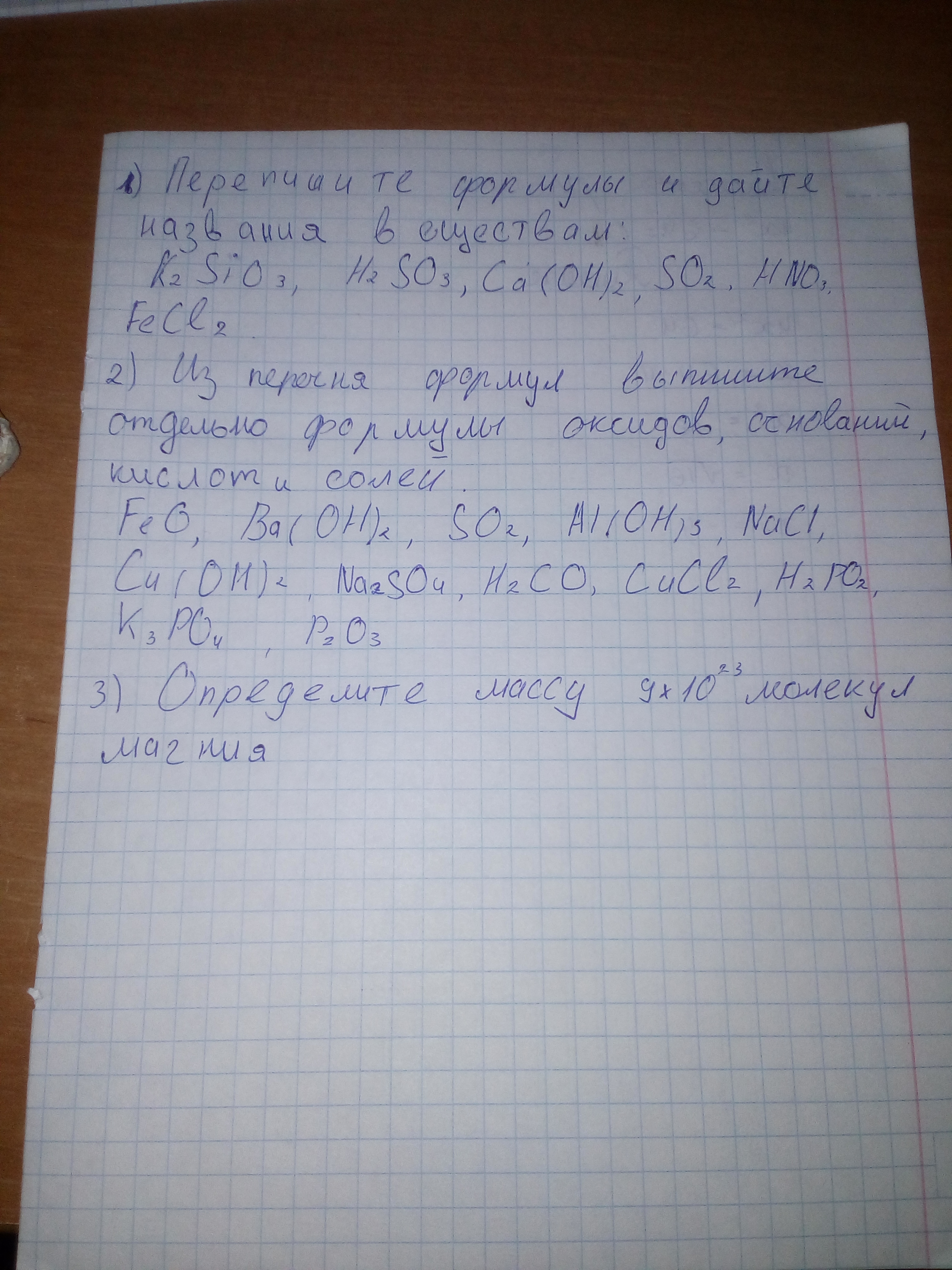 1. Силикатный кислота, сульфитно кислота,, кальций гидроксид, сернистый газ (серы (IV) оксид), азотная кислота, железа (II) хлорид.2. оксиды: FeO, SO2, P2O3основания Ba (OH) 2, AL (OH) 3,кислоты H2CO3, H2PO2остальные соли3. n = 1 моль, m = 24г
