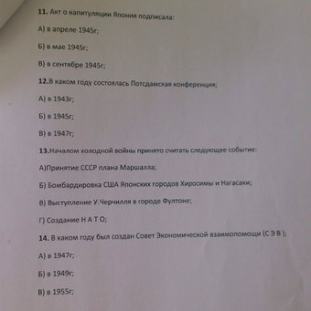 12) Потсдамская конференция состоялась в 1945 году между лидерами СССР, США и Англии (Сталин, Трумен, Черчилль)
