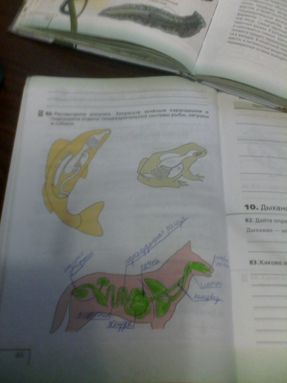 рассмотрите рисунки. Закрасьте зелёным карандашом и подпиши отделы пищеварительной системы рыбы, лягушки и собаки. я собаку уже сделала