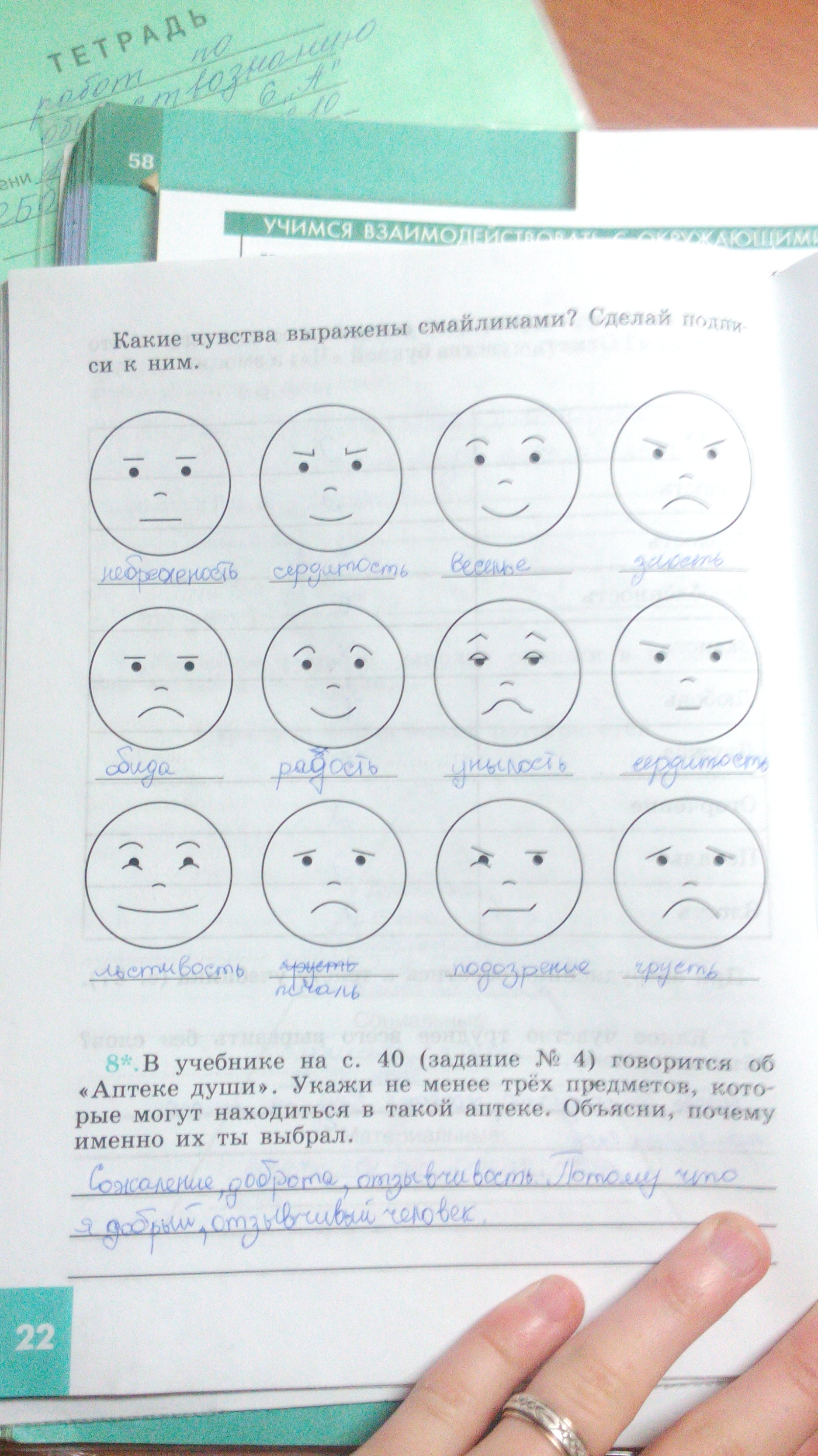 Нейтральность, хитрость, радость, злость, недовольство, умиротворение, ... , раздрожение, умиление, печаль, подозрение, грусть.