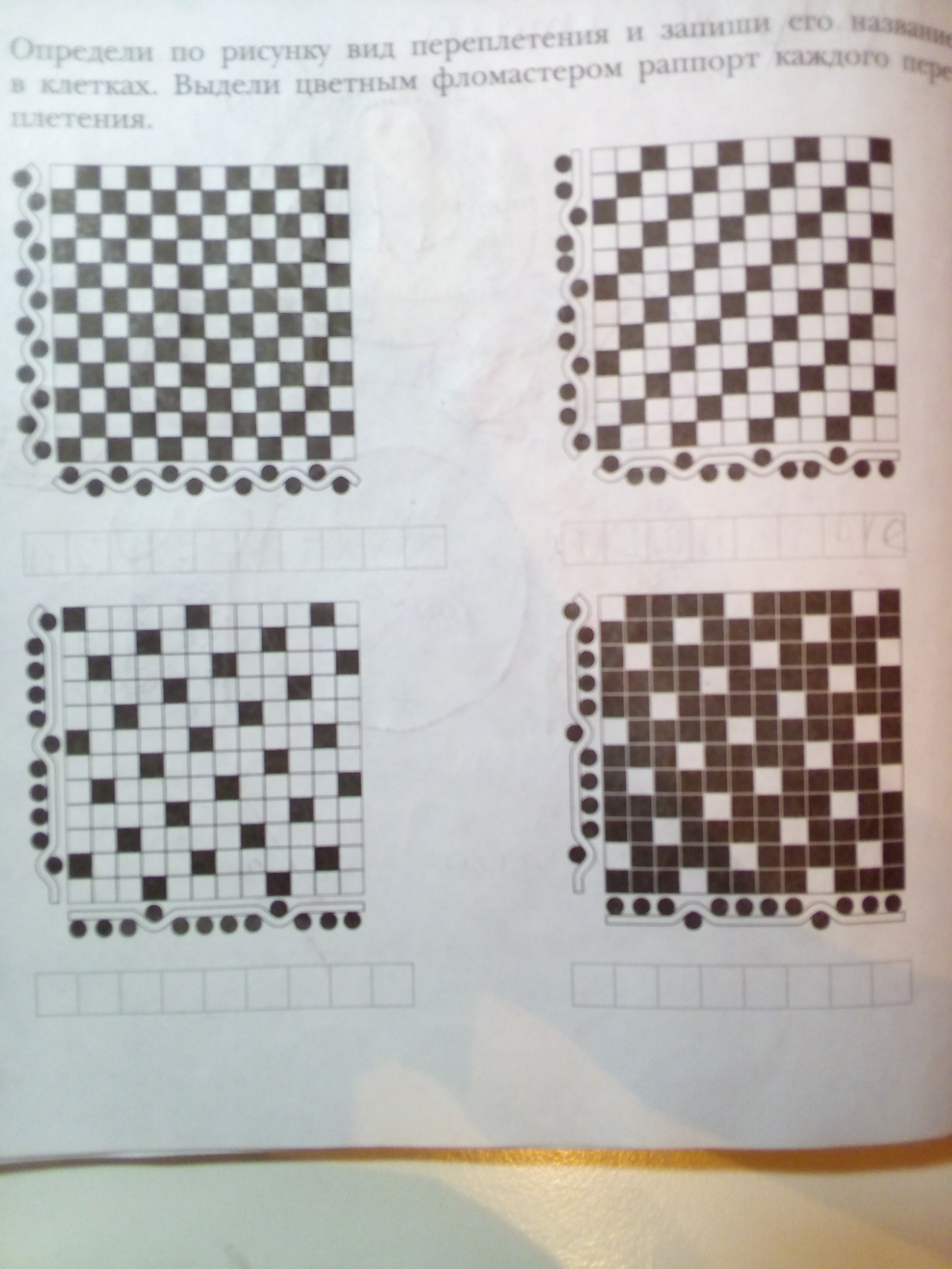 1-ое полотняное 2-оесаржевое 3-ее сатиновое 4-ое атласное