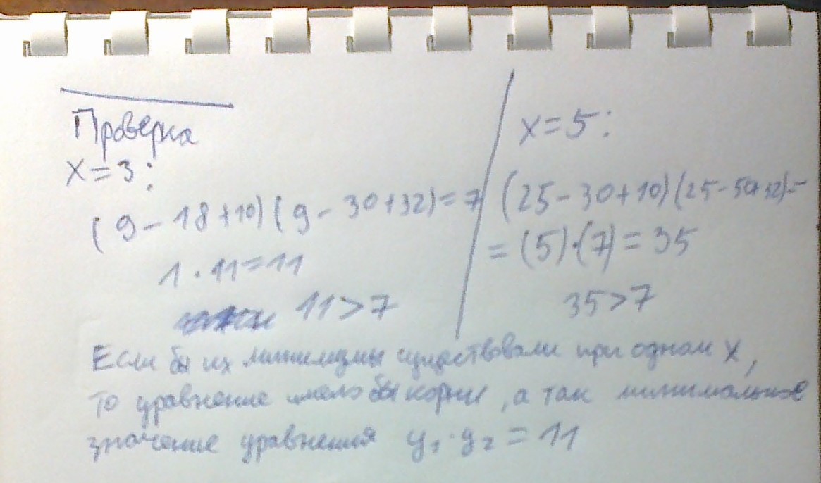 Если бы минимумы функций существовали при одном х (и их произведение равнялось 7), то уравнение имело бы корни, а так минимальное значение уравнения y1*y2=11