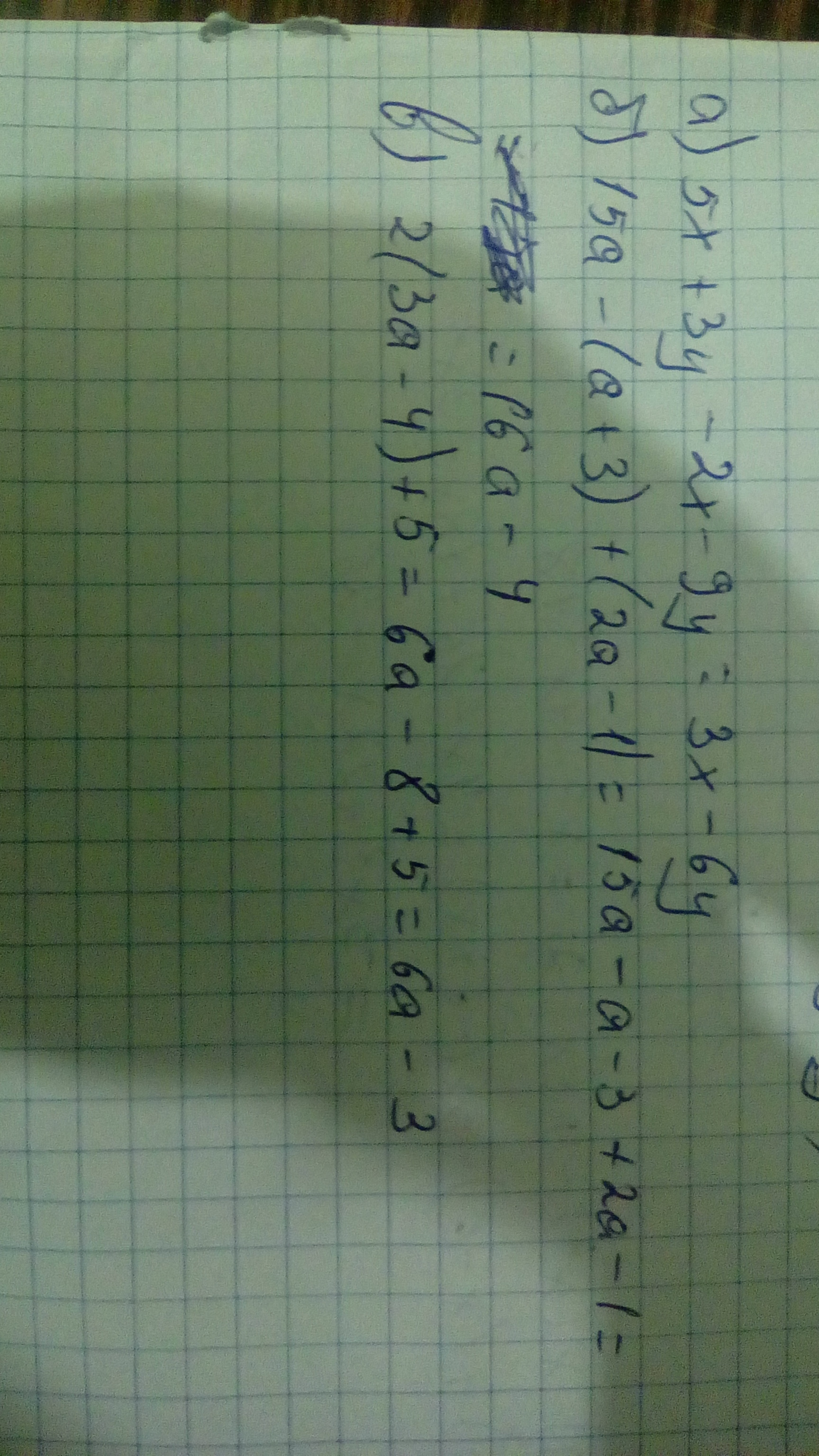Упростите выражение: а) 5х+3у-2х-9у; б) 15а-(а+3)+(2а-1); в) 2(3а-4)+5.