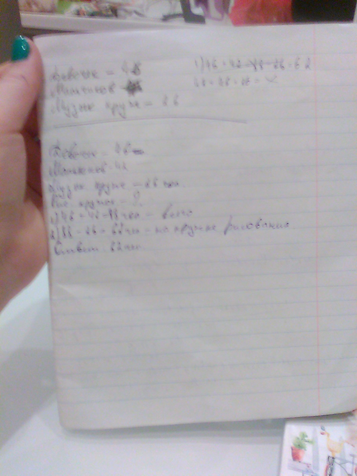 в школе 46 девочек и 42 мальчика. 26 детей занимаются в музыкальном кружке, остальные в кружке рисования. сколько учеников ходят в кружок рисования. помогите написать краткую запись и решение.