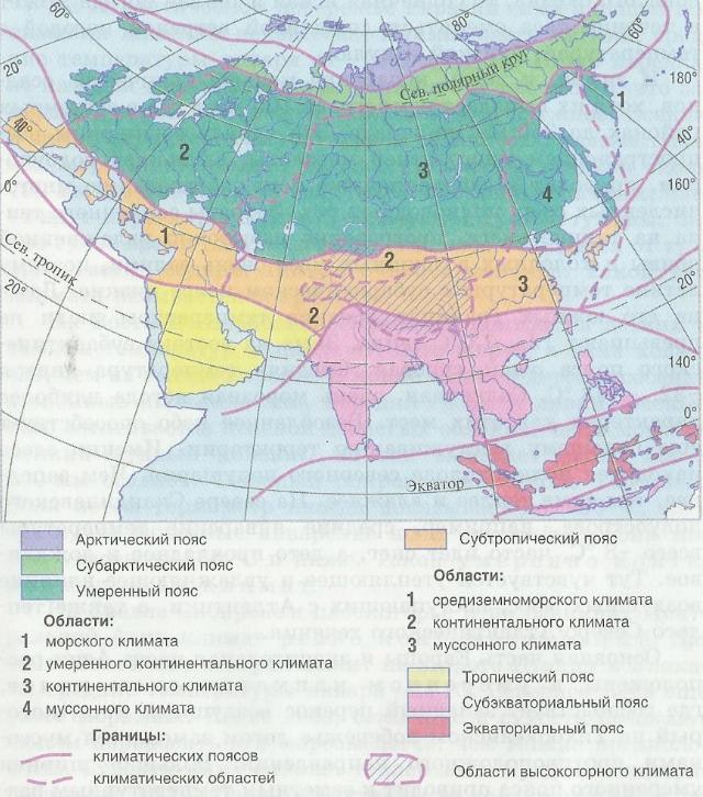 1 Евразия расположена в следующих климатических поясах:арктический,субарктический,умеренный,субтропический,тропический,субэкваториальный и экваториальный.Она лежит в следующих климатических зонах:зона арктических пустынь,тундра,лесотундра,тайга,смешанные и широколиственные леса,степи и лесостепи,пустыни и полупустыни,саванны и редколесья,вечнозелёные леса,переменно-влажные леса,влажные экваториальные леса,области высотной поясности.