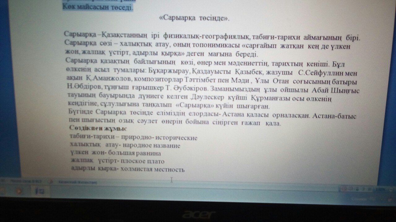 "Сарыарка" –В крупных физико-географических, природно-исторические зоны. Слово "сарыарка" – народное название, его топонимика «большой сарғайып филе, широкие, плоские плато, казахского мелкосопочника қырқа означает». Сарыарка в источник богатства, искусства, культуры, истории рудника. Это благородные уроженцы края: Бухар-жырауский, Қаз дауысты Қазыбек, писатель.И поэт Г. с. сейфуллина.Аманжолова, композиторы и Мади Таттимбета , героя Великой Отечественной войны Н.Абдирова, первого космонавта Т. Аубакиров. Абая, великого мыслителя современности горы Чингиз родился в печени . История этого края кеңдігіне кюйши Курмангазы, удивилась красоте «Сарыарка», выпущенные состояния. Грудь сегодня "Сарыарка" столицы страны - города Астаны. Астана - удивительный город на протяжении лет передового архитектурного искусства запада и востока. «Признание " означает» сратегиясы: природно - историко – природно - исторические название народное - народное название филе большое - большая равнина плоские плато - плоское плато қырқа казахского мелкосопочника - холмистая местность