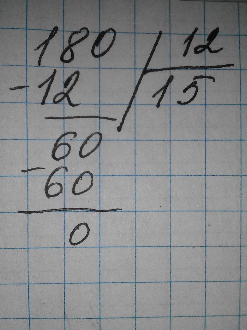 180÷12=берем 1 получается 18-12=6сносим 0 получается 60÷12 берем 5 в результате получается 180÷12=15