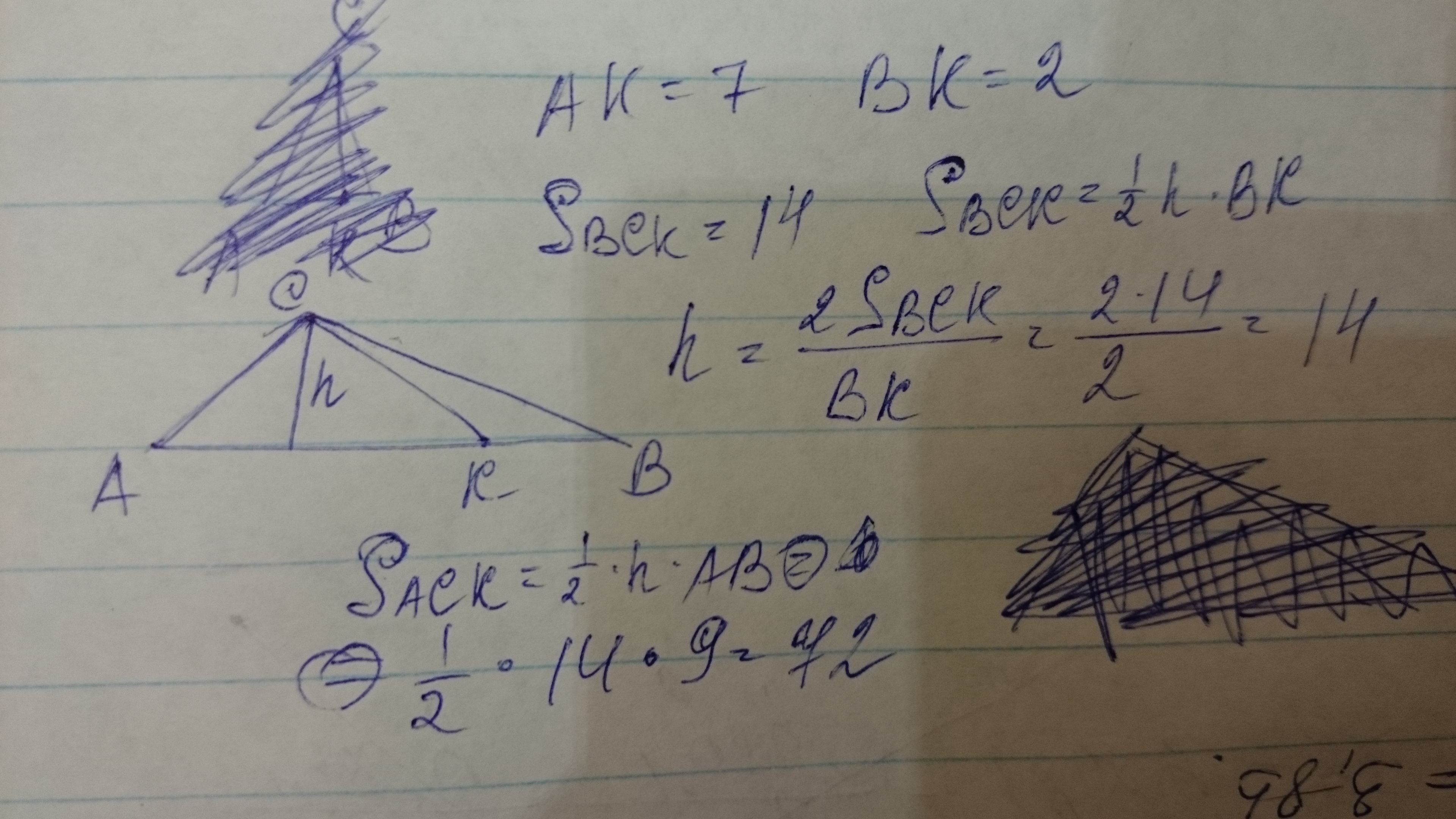 в треугольнике abc на стороне ab отмечена точка k так, что ak=7, bk=2. найдите площадь треугольника ack, если известно, что площадь треуг bck =14
