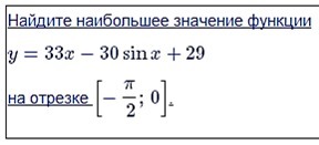 Производная y* = 33-30Cosx > 0, поэтому функция y = 33x-30Sinx+29 возрастающая. Максимальное значение на указанном промежутке она принимает при х=0: y(0)=29.