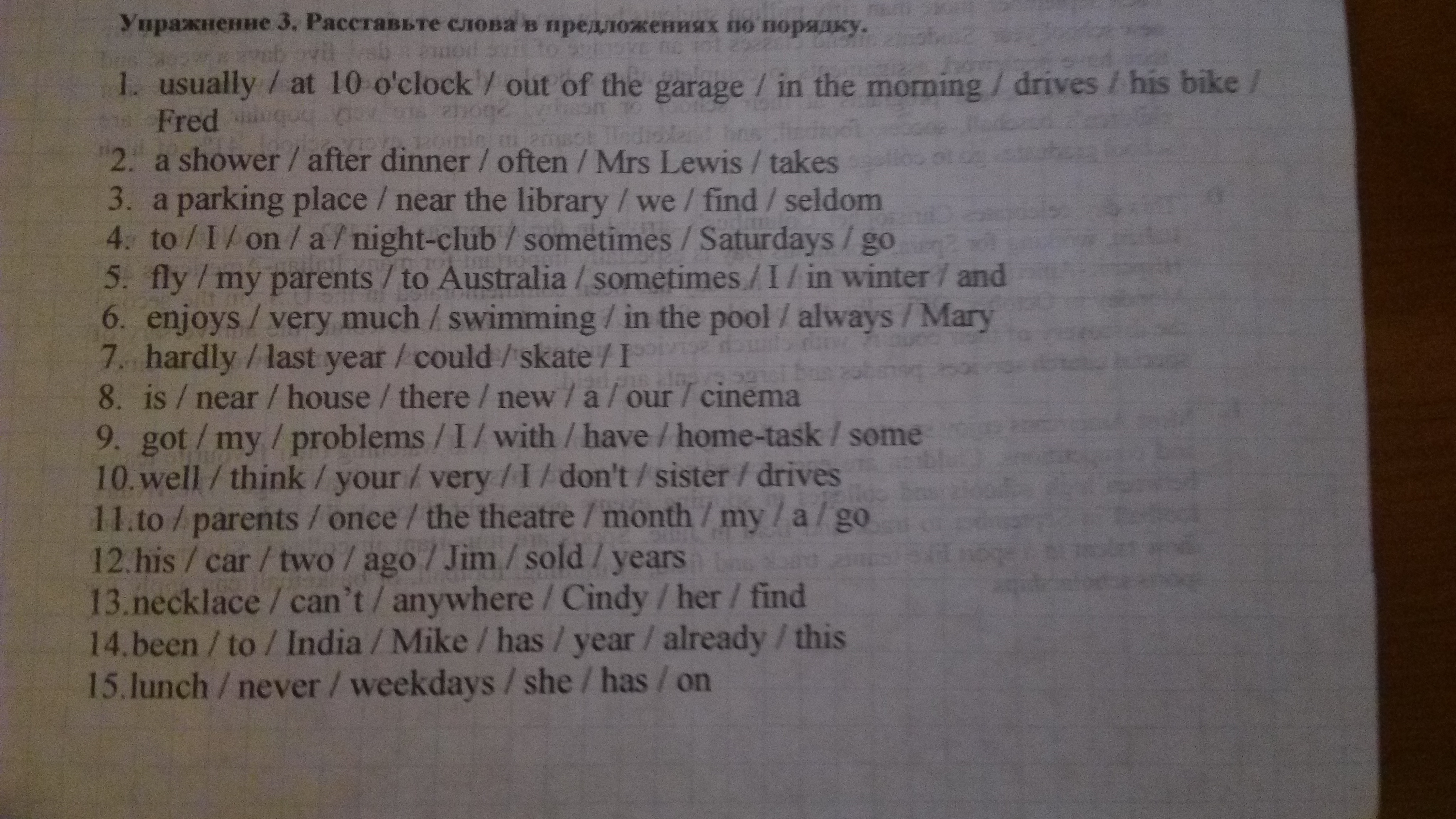 1. usually Fred drives his bike out of the garage at 10 o'clock in the morning