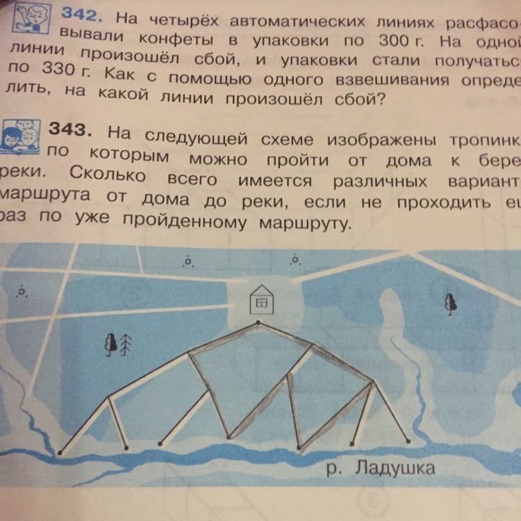 На следущей схеме изоброжены тропинки по которым можно пройти от дома к берегу реки.сколько всего имеется различных вариантов маршрута от реки,если не проходить ещё раз по уже пройденному маршруту
